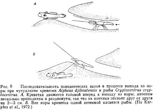 Креветки рода Alphaeus выкапывают норы, которые бычки Cryptocentrus используют как убежища в среде, где иначе трудно укрыться от врагов. Креветка почти ничего -не видит и, когда покидает -нору, с помощью своих антенн постоянно поддерживает контакт с рыбой, получая таким образом предупреждения о любых изменениях обстановки (рис. 6). Бычок пользуется местообитанием с донными осадками, содержащими обильный корм, а креветка — зрительной системой партнера, позволяющей ей, не подвергаясь опасности, на короткое время покидать нору и питаться снаружи от нее (Frickc, 1975).