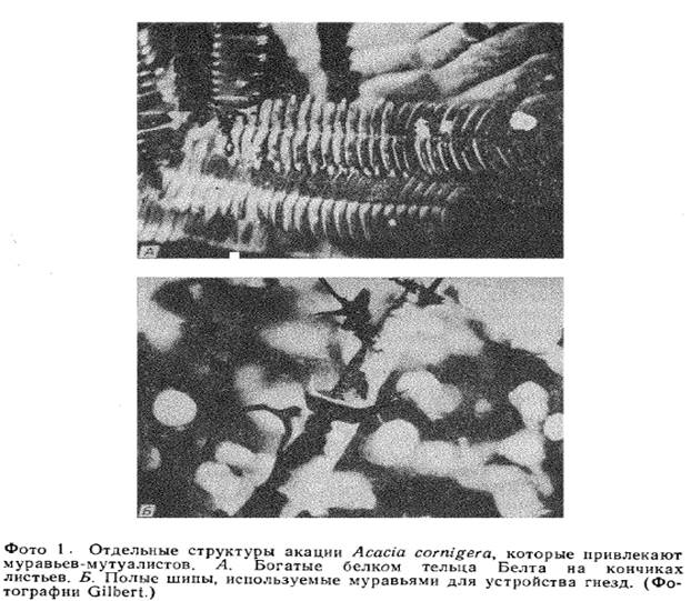 Еще одно такое мутуалистическое взаимодействие типа чистильщик—клиент описано (Janzen, 1967) в Центральной Америке у одной из акаций (Acacia cornigera) с муравьями Pseudomyrrnex ferruginea. В полых шипах этого растения муравьи строят гнезда, а листочки перистых листьев дерева несут на концах богатые белком тельца Белта (фото 1), которые муравьи собирают и используют в пищу; кроме того, на листьях муравьев привлекают выделяющие сахар нектарники. Со своей стороны, насекомые защищают эти небольшие светолюбивые деревца от конкурентов, активно «обстригая» чужие побеги, проникающие в их крону, а также защищают растение от фитофагов.