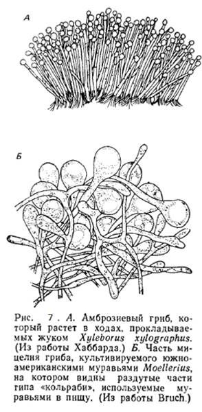 и грибами — редуцентами возникают весьма специализированные мутуалистические отношения. Жуки-короеды (семейство Scolytidae) прокладывают в мертвой или отмирающей древесине глубокие ходы, в которых поселяются специфичные для данного вида жуков грибы, постоянно выедаемые личинками. Эти насекомые, вероятно, переносят «посевной материал» грибов в своем пищеварительном тракте, хотя у некоторых видов на голове обнаружены специальные щетки из волосков, собирающие споры. Грибы служат жукам пищей и используют их при заселении новых ходов в древесине—отношения вполне мутуалистические (рис. 7).