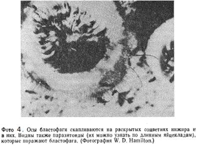 естественного отбора, когда каждый этап эволюции соцветия инжира вызывал ответное изменение в поведении бластофаг (Wiebes, 1982). Насекомое стало не только опылителем, но и паразитом. Эволюция этой сложной экосистемы пошла еще дальше. С большинством видов инжира связано два разных вида перепончатокрылых, каждый из которых специализирован на определенном типе цветков внутри соцветия (кроме того, обычно существует два вида паразитических перепончатокрылых, специализирующихся на этих двух видах-опылителях). Часто наблюдаются представители этого же семейства насекомых, которые откладывают яйца в женские цветки инжира, но не играют никакой роли в процессе опыления. Их нельзя считать мутуалистами, скорее они напоминают кукушку, подкидывающую яйца в гнезда, «свитые» инжиром, но никак не расплачивающуюся за услуги.