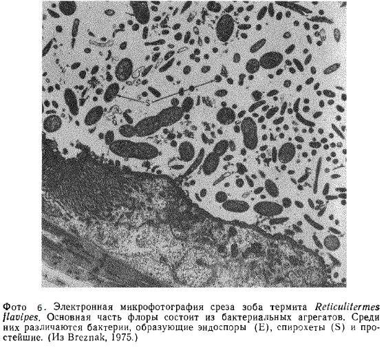 родов, обнаруженных только у термитов и у нескольких питающихся древесиной видов тараканов (Cryptocercus). Имеются и бактерии, но именно простейшие обеспечивают разложение большей части целлюлозы. Частицы древесины поглощаются ими, и целлюлоза переваривается внутриклеточно с выделением углекислого газа.и водорода. Основными продуктами расщепления (как и в рубце жвачных) являются летучие жирные кислоты, в первую очередь уксусная, которая всасывается в задней кишке. Без простейших термиты переваривать древесину не могут.