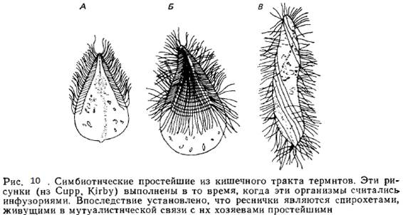 1. Важными представителями бактериальной флоры являются спирохеты; они вместе с палочковидными формами концентрируются на поверхности жгутиконосцев. В кишечнике одного из термитов (Mastoterma paradoxa) обнаружены спирохеты, которые, двигаясь синхронно, фактически продвигали вперед простейшее. Они настолько хорошо заметны, что когда-то таких жгутиконосцев считали инфузориями (рис. 10). Это взаимодействие бактерий и простейших мутуалистическое — спирохеты получают от жгутиковых.питательные вещества, и одновременно придают им подвижность. Итак, в данном случае пара видов мутуалистически обитает в третьем виде.