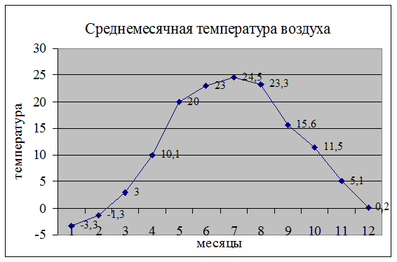 Среднемесячная температура воздуха | -3,3 | 1,3 | 3 | 10,1 | 20 | 23 | 24,5 | 23,3 | 15,6 | 11,5 | 5,1 | 0,2 |