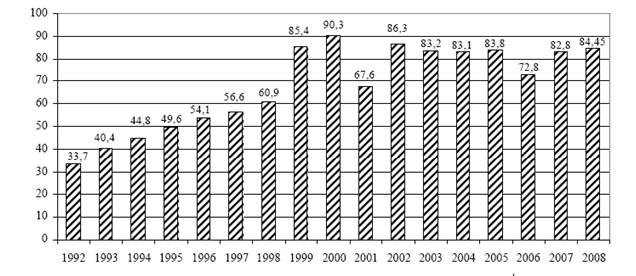 По данным формы № 2 федерального государственного статистического наблюдения, в 2008 г. в России зарегистрировано 120 021 сл. впервые выявленного активного туберкулеза (в 2007 г. – 117 738 сл.). Показатель заболеваемости туберкулезом составил 84,45 на 100 тыс. населения (в 2007 г. – 82,8 на 100 тыс.) и в 2,5 раза превысил уровень заболеваемости населения туберкулезом до начала ее роста в 1989 г. (33,0 на 100 тыс. населения) (рис. 1).