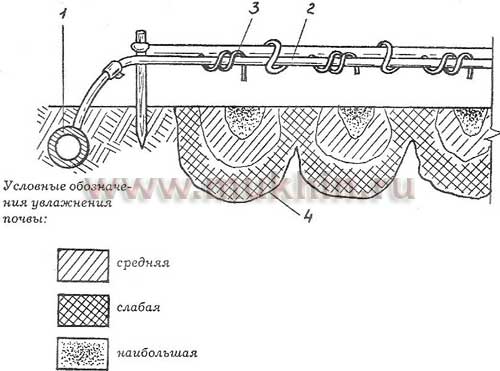 1 — трубка-увлажнитель; 2 — отверстия в стенке трубки; 3 — полиэтиленовая пленка; 4 — выход воды в почву