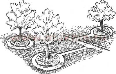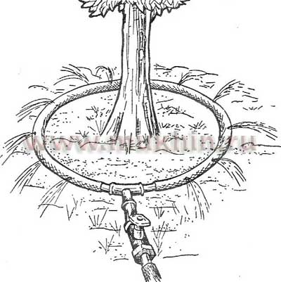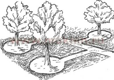 Для проведения полива по лункам-кольцам (рис.2) необходимо устроить вокруг каждого дерева кольцевую канаву (глубина — 0,3-0,4 м, ширина — 0,8-2 м). Затопление лунок водой производится в несколько приемов. Этот способ, в отличие от полива по чашам, требует меньше физических затрат. Плюс к этому происходит более равномерное увлажнение почвы, которая меньше уплотняется, в результате чего не возникает препятствий для поступления воздуха к корням.