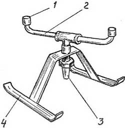 Дождевальник «Сегнерово колесо». Эта установка включает в себя горизонтальную трубку с двумя головками-распылителями на концах, а также короткую вертикальную трубку, которая соединяет горизонтальную со шлангом, подводящим воду. Подставка, на которой расположены все детали, опирается на лыжи (рис.4). При работе дождевальника вода разбрызгивается из вращающейся трубки на несколько метров.