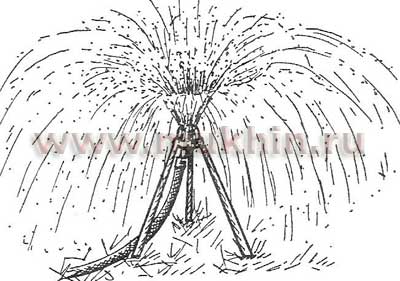 Дождевальная установка «Улитка». Механизм работы этой установки достаточно прост. С помощью шланга осуществляется подача воды в насадку через патрубок по касательной. В ней струи воды завихряются, и «дождевой поток», принимая форму зонта, выходит из отверстия. Установка разбрызгивает воду по кругу в радиусе 1-2 м (рис.5). После полива одного участка земли «Улитку» переносят на другой. Помимо обычного дождевания, применяется и мелкодисперсное (аэрозольное). Его используют при неблагоприятных для растений климатических условиях, например при воздушных засухах и суховеях.