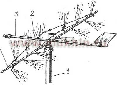При аэрозольном дождевании образуются капли размером 400...600 мк. Они прекрасно удерживаются на листьях растений. Наилучший эффект достигается при частом или непрерывном распределении воды на орошаемом участке. Для аэрозольного дождевания используются насадки, а также диспергаторы различных конструкций. Оборудование для мелкодисперсного дождевания включает мачту высотой 9-12 м и поворотную штангу с диспергаторами. Штанга работает по принципу флюгера, т.е. есть в зависимости от силы и направления ветра (рис.6).