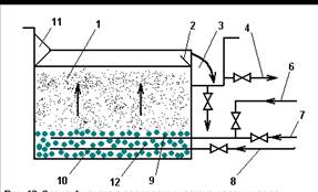 Рис 1 Схема фильтра с восходящим потоком воды и водо-воздушной промывкой фильтра:1-загрузка;2-пескоулавливающий желоб;3-карман;4-отвод фильтрованной воды;5-отвод промывной воды;6-подача воздуха на промывку;7-подача очищаемой воды;8-подача воздуха;9 и 10-распределитльные системы соответственно для подачи воды и воздуха;11-струенаправляющий выступ;12-поддерживающий гравийный слой.