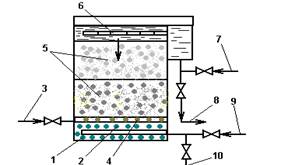 Рис 2 Схема каркасно-засыпного фильтра:1-поддерживающие гравийные слои;2-распределительная система для воды;3-подача воздуха при промывке;4-гравийно-песчаная засыпка;5-гравийный каркас;6-трубчатая система для подачи исходной и отведения промывной воды;7-подача исходной воды;8-отвод промывной воды;9-подача промывной воды;10-отвод фильтра.