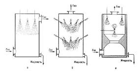 На рис. 4 показаны некоторые типы распыливающих абсорберов, выполненных в виде полых колонн. Газ в них движется обычно снизу вверх, а жидкость подается через расположенные в верхней части колонны распылители с направлением факела распыла сверху вниз (рис 4, а) или под некоторым углом к горизонтальной плоскости (рис 4, б). Во многих случаях распылители располагают в несколько ярусов. Применяют также комбинированную установку распылителей часть факелом вверх, а часть – факелом вниз (рис 5).