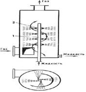 По своему устройству к ротоклону близок ударно — распылительный абсорбер (рис.12), выполненный в виде колонного аппарата с многоступенчатым контактом. При этом в каждой ступени осуществляется прямоток, а в аппарате в целом — противоток.