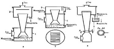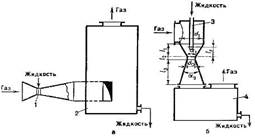 2.2)Абсорберы второй группы Ко второй группе относятся аппараты, в которых осуществляется восходящий прямоток. Характерным представителем этой группы является бесфорсуночный абсорбер Вентури (рис.9, а), в котором жидкость эжектируется в конфузор поступающим в него газом.