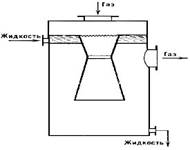 На рис. 8 показан абсорбер Вентури с пленочным орошением. В этом абсорбере жидкость поступает в конфузор, переливаясь через его верхний обрез. Далее жидкость стекает по конфузору в виде пленки и распыливается газом при прохождении через горловину.