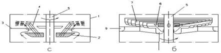 Рис.14. Абсорберы с вращающимся погружным конусом: а — абсорбер Фельда; б — абсорбер Сафина; 1 — кожух; 2 — тарелка; 3 — перегородка; 4 — конус; 5 — вал; 6 — конус питатель; 7 — кольцо; 8 — кольцевой желоб; 9 — периферийный желоб; 10 — переток.