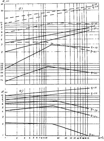 Зависимость расстояния от места выпуска сточных вод до створа практически полного перемешивания их с речными от расходов воды в реке ( Q , м3 /с) и сточных вод (q , м3 /с). Река Тагил ниже п. Верхний Тагил а) период открытого русла; б) период ледостава: начало, _ _ _ _ конец. (По И.С. Шахову, 2000)