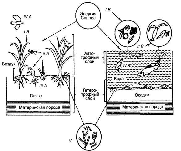 I — автотрофы: А — трава; В — фитопланктон. II — растительные животные: А — насекомые и млекопитающие лугопастбищного сообщества; В — зоопланктон в толще воды. III — детритоядные: А — почвенные беспозвоночные на суше; В — донные беспозвоночные в воде. IV — хищники: А — птицы и другие животные на суше; В — рыбы в воде. V — сапротрофы: разлагающие бактерии и грибы