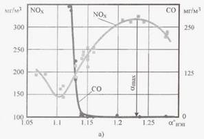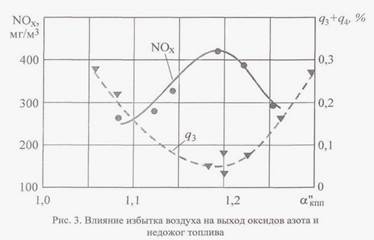 Влияние избытков воздуха на образование оксидов азота описывается экстремальной зависимостью с максимумом при аmaх = 1,15-1,25 для газомазутных котлов и аmах = 1,4-1,5 для пылеугольных котлов в зависимости от конструкции горелочных устройств и состояния топочной камеры (рис. 2). Причем максимум содержания NOx в дымовых газах соответствует такому значению коэффициента избытка воздуха, при котором в данных условиях достигается наиболее полное сгорание топлива (рис.3).