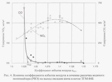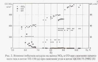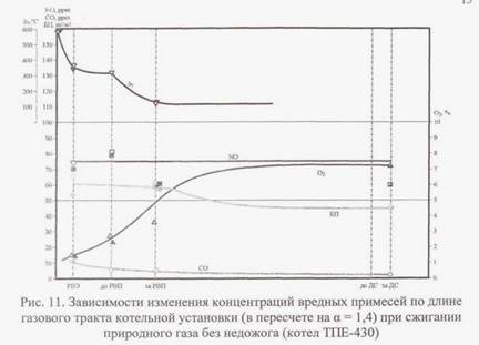 Проведенные экспериментальные исследования процессов конверсии СО и БП в газовом тракте котельных установок показали принципиальную возможность реализации в котле различных режимов сжигания (рис. 10).