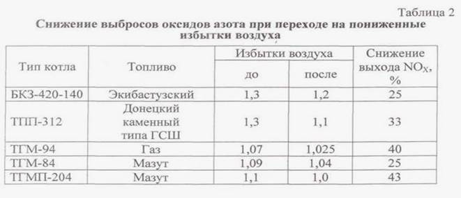 Одним из наиболее легко реализуемых режимных мероприятий является снижение избытка воздуха в топке. В результате уменьшения содержания кислорода в зоне горения происходит подавление образования как термических, так и топливных NOx. Поэтому данное мероприятие может быть применено при сжигании любых видов органического топлива. Оно позволяет не только снизить выбросы NOx, но и несколько повысить КПД котла за счет снижения потерь теплоты с уходящими газами и затрат энергии на собственные нужды.