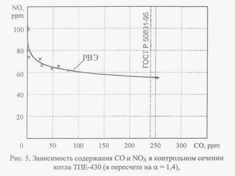 Еще больший эффект снижения выбросов оксидов азота, как показали результаты экспериментов, наблюдается при дальнейшем снижении а ниже значений араб вплоть до появления химического недожога (см. табл. 2). Причем основное снижение эмиссии NOX происходит уже при появлении умеренного недожога топлива (рис. 5). Так, повышение химического недожога, сопровождавшееся ростом концентрации СО в продуктах сгорания (в контрольном сечении, в данном случае сечение РВЭ) от 0 до 50 ррm (62,5 мг/м3), приводило к снижению содержания оксидов азота на 25 — 30%. При дальнейшем увеличении недожога, когда содержание СО увеличивалось с 50 ррm до нормативных значений (300 мг/м3 или 240 ррm), происходило дополнительное линейное снижение выхода NOX на 10 — 12% от первоначального значения.