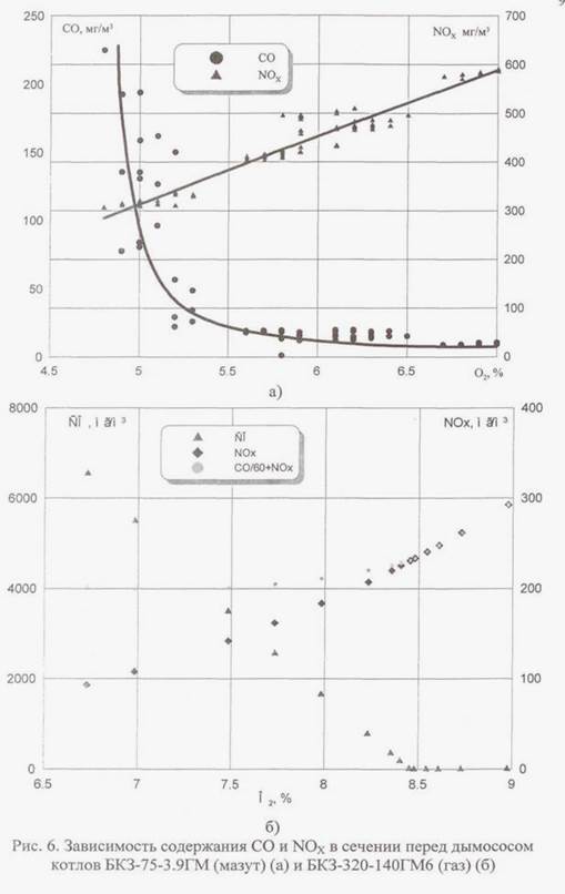 Режим сжигания без недожога (рис. 10а) характеризуется повышенным выходом NOX и пониженным содержанием БП по всему газовому тракту (рис. 11). Содержание СО в дымовых газах в режимном сечении и за дымососом не превышает 5-10 ррm (6,25-12,5 мг/м3 ). Такие режимы, как правило, реализованы в режимной карте котла.