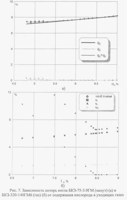 Аналогичные результаты были получены и при сжигании мазута в котле БКЗ-75-3.9ГМ ТЭЦ ОАО «ЧМЗ» (см. рис. 6). При работе котла в соответствии с режимной картой выбросы оксидов азота были максимальны и составляли 550-580 мг/м3. При снижении избытков воздуха до достижения концентрации C0=50-150 мг/м3 содержание NOX уменьшилось до 320-340 мг/м3, т.е. приблизительно на 40%. Следует отметить, что потери с уходящими газами q2 в этом случае снизились на 0,65% (см. рис. 7) в то время как потери с химическим недожогом возросли незначительно, приблизительно до 0,15%. Таким образом суммарно потери q2+q3 уменьшились приблизительно на 0,5%. Кроме этого также снизились затраты на собственные нужды — за счет снижения объемов воздуха и продуктов сгорания проходящих через ДС и ДВ. При сжигании природного газа также наблюдается повышение КПД котла при переходе на режимы с контролируемым недожогом (см. рис. 6б и 7б).