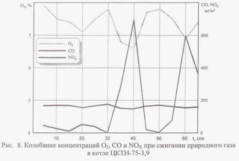 Следует особо отметить, что на многих котлах наблюдается значительные колебания концентрации кислорода в продуктах сгорания. Это может быть связано как с работой автоматики, так и с плохим техническим состоянием котельного агрегата. Так, например, на котле ЦКТИ-75-3,9, установленном на ТЭЦ ОАО «ЧМЗ» наблюдались колебания концентрации О2 в уходящих газах в диапазоне 6,8-7,8% об, при этом при попытке наладить режим с контролируемым недожогом концентрация СО составляла от 0 до 700 мг/м3 (рис. 8). В связи с этим для подобных котлов требуется проведение предварительных работ по уплотнению и настройке АСР.