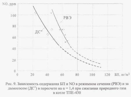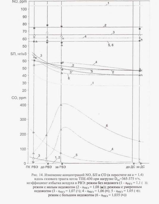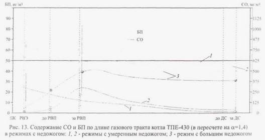 При этом величина химического недожога должна быть ограничена содержанием вредных примесей в дымовых газах за дымососом (в пересчете на а = 1,4): для СО — не более 100 ррm (125 мг/м3 ) и для БП — 60 — 100 нг/м3 .