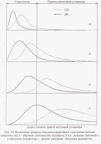Режимы с недожогом топлива характеризуются меньшими концентрациями О2 в зоне горения и пониженным уровнем температур в топочной камере, в результате чего происходит затягивание процессов догорания продуктов неполного сгорания топлива в газоход котельной установки. При этом в зависимости от степени химического недожога (т.е. от затягивания процесса горения по длине газового тракта) принципиально возможны следующие варианты изменения концентраций БП и СО в газовом тракте котельной установки (рис. 10б, в, г).