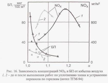 Поэтому перед внедрением режимов сжигания топлива с контролируемым умеренным недожогом следует провести уплотнение топки, поверку штатных приборов и устранение перекосов в топливовоздушных трактах. Последнее позволяет оптимизировать процесс сжигания топлива и уменьшить выход СО и БП. При этом максимальные значения концентрации NOX остаются без изменения, но вся кривая зависимости NOx(a) сдвигается в область меньших избытков воздуха (рис. 16).
