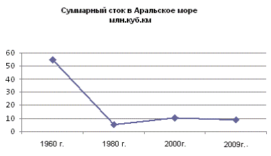 До 1960 года отбор воды на все нужды региона не превышал 63 км3, что позволяло сохранять стабильный водный баланс Арала. К середине 80 — х годов суммарный водозабор на нужды народного хозяйства, испарение и фильтрацию с поверхности водохранилищ, использование воды Афганистаном и Ираном составил порядка 95,0 км3. Суммарный водозабор Кыргызстана по этим рекам не превышает 4 км3 в год или 4% к общему количеству. За последние 8-10 лет наблюдается тенденция к снижению водозабора, примерно на 10%, всеми республиками бассейна Аральского моря кроме Республики Узбекистан. Несмотря на это уровень Аральского моря продолжает снижаться — с 1989г. по 1997г. снижение составило 4,28 м. На рисунке 1 представлен график суммарного стока в Аральское море.