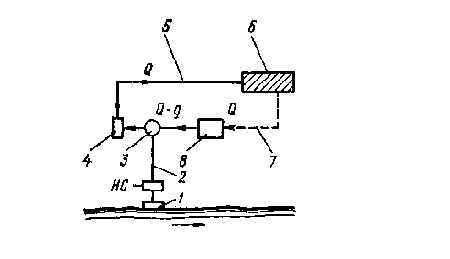1 – водоприемник, совмещенный с насосной станцией (НС); 2 – водоводы; 3 – сборный колодец; 4 – циркуляционная насосная станция; 5 – внутризаводской водовод; 6 – цех, где вода используется для охлаждения; 7 – сбросной трубопровод; 8 – охладитель