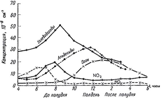 Рис. 4. Средние концентрации загрязняющих веществ в деловой части Лос-Анджелеса в дни, когда наблюдалось сильное раздражение глаз. Данные за 1953 – 1958 гг.