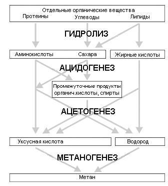При анаэробном преобразовании органических субстратов в метан под воздействием микроорганизмов должны быть последовательно реализованы 4 стадии разложения. Отдельные группы органических загрязнений (углеводы, протеины, липиды/ жиры) в процессе гидролиза преобразуются сначала в соответствующие мономеры (сахара, аминокислоты, жирные кислоты). Далее эти мономеры в ходе ферментативного разложения (ацитогенеза) преобразуются в короткоцепочечные органические кислоты, спирты и альдегиды, которые затем окисляются дальше в уксусную кислоту, что связано с получением водорода. Только после этого доходит очередь до образования метана на этапе метаногенеза. В качестве побочного продукта наряду с метаном образуется также и углекислый газ.
