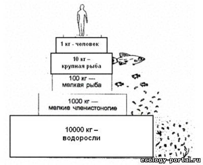 членистоногих, а 10 кг рыбы — для накопления 1 кг вещества человека. Таким образом, пищевая цепь представляется