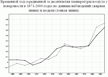 О точности моделирования можно судить по сопоставлению данных наблюдений за температурой в период с 1875 по 1995 гг. и расчетами на модели. Такое сопоставление показывает, что модель ИВМ РАН демонстрирует результаты, очень близкие к реальным. В частности, в модели фиксируется замедление роста температуры в 1950-1970 гг. и последовавший за этим быстрый рост.