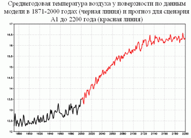 Значительное потепление климата произойдет и в Арктике. Даже по сценарию A1, во второй половине XXII века температура в Арктике вырастет примерно на 10 градусов по сравнению со второй половиной XX века. Не исключено, что уже менее чем через 200 лет полярные льды будут сохраняться лишь зимой, а летом будут таять. Важно отметить и то, что хотя, согласно условиям расчета, в XXII веке выбросы парниковых газов фиксировались на одном уровне, рост температуры на Земле продолжался «по инерции» в течение первых нескольких десятилетий следующего столетия. Значительно — на 4-6 градусов, в соответствии со сценарием A1 — потеплеет в умеренных широтах континентов северного полушария. Наименее сильным будет потепление над океанами в южном полушарии — здесь потеплеет на 2-3 градуса.