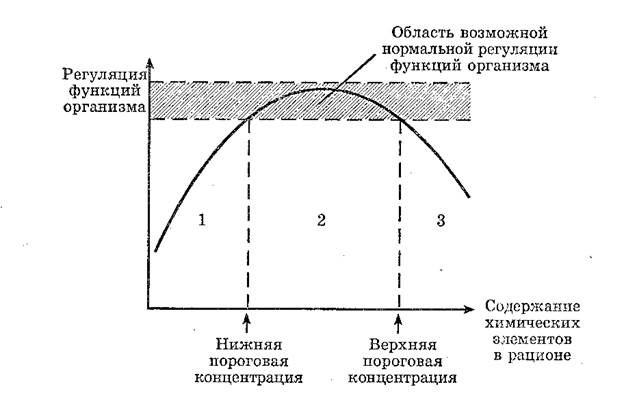 Рис. 1. Зависимость регуляторных процессов в организме от содержания химических элементов в рационе (по В.В. Ковальскому, 1976)
