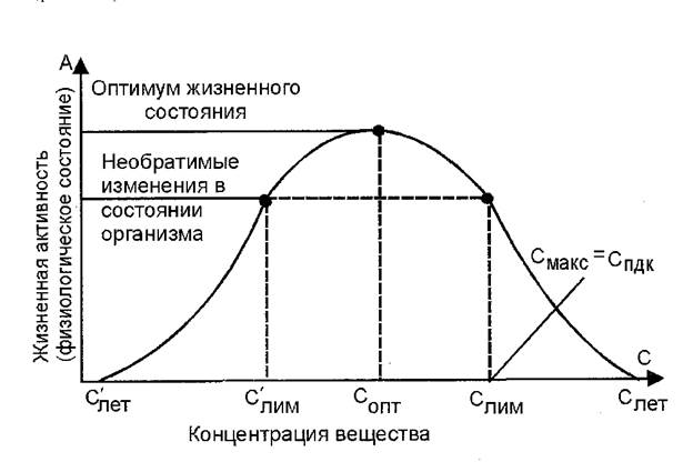 Слет, С ,лет — летальные концентрации токсичного вещества; Слим, С1лим. — лимитирующие концентрации токсичного вещества; С опт — оптимальная концентрация