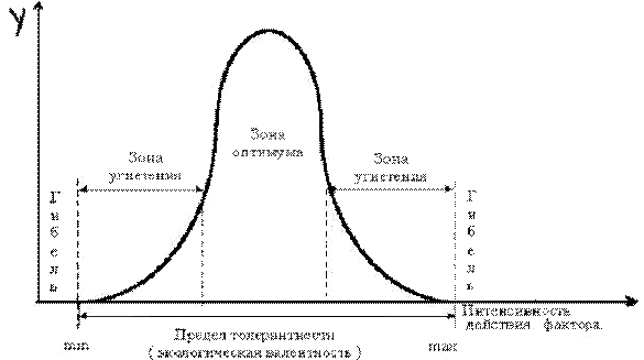 Понятие о том, что наравне с минимумом лимитирующим фактором может быть и максимум, ввел спустя 70 лет в 1913 г. после Либиха, американский зоолог В.Шелфорд. Он обратил внимание на то, что ограничивать развитие живых организмов могут не только те экологические факторы, значения которых минимальны, но и те, которые характеризуются экологическим максимумом, и сформулировал закон толерантности: «лимитирующим фактором процветания популяции (организма) может быть как минимум, так и максимум экологического воздействия, а диапазон между ними определяет величину выносливости (предел толерантности) или экологическую валентность организма к данному фактору)» (рис. 2).
