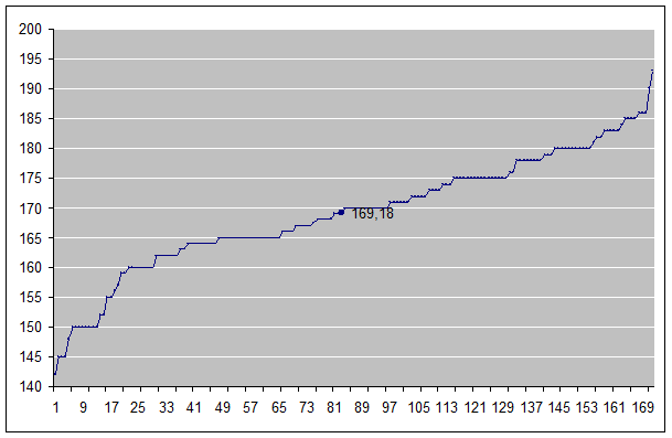 150 см, 150 см, 152 см, 165 см, 170 см, 162 см, 174 см, 165 см, 167 см, 165 см, 148 см, 169 см, 164 см, 150 см, 152 см, 145 см, 156 см, 165 см, 160 см, 160 см, 142 см, 160 см. 165 см.