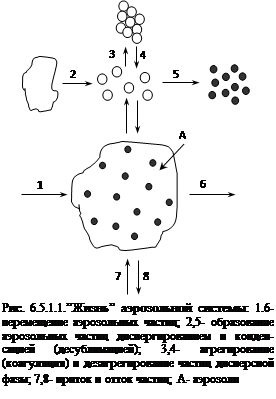 Концентрация и размер частиц дисперсной фазы аэрозолей все время изменяются: частицы возникают и исчезают, укрупняются и дробятся на более мелкие, перемещаются — какая-то часть частиц аэрозольной системы покидают ее, что компенсируется за счет притока новых частиц (см. рис. 6.5.1.1).